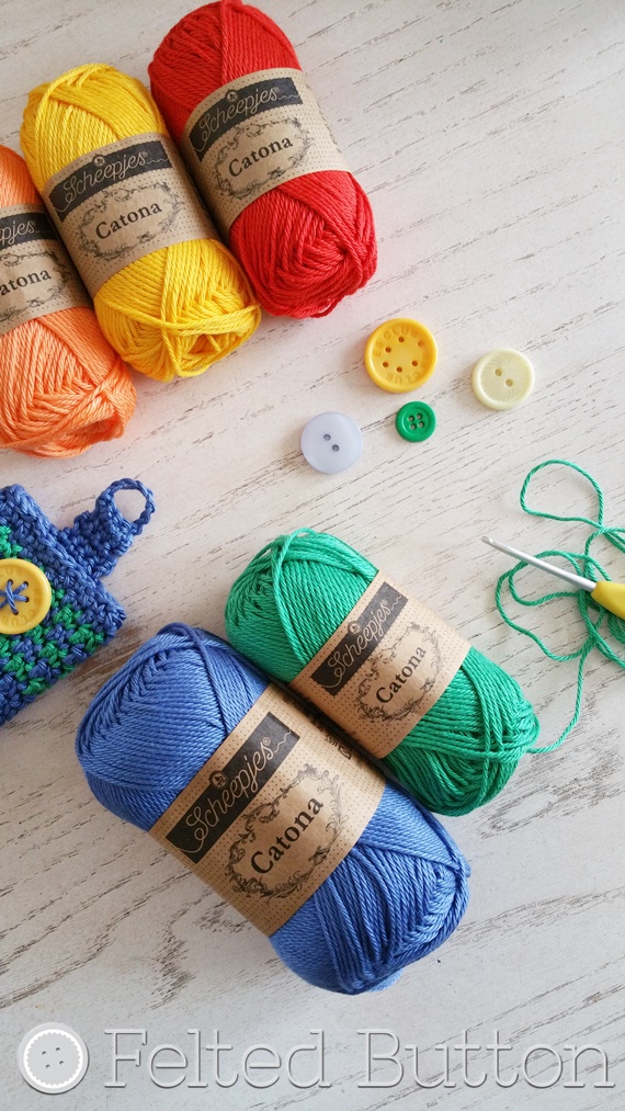 Let me tell you that the Catona yarn (100% mercerized cotton) is superb for the durable kind of project I'm working on. It has fabulous stitch definition, won't fade or fuzz (because it's been treated) and is surprisingly soft. You can see the two sizes of skeins available in the pic above--50g and 25g, so you can get just the right amount for your specific project. I am loving the 25g balls--just perfectly sized for projects with lots of colors! Who, me?? Colors?? And at about $1.25/skein--you can get all of the colors you want! Get your hooks into the Catona (or any Scheepjes yarn) from Wool Warehouse.